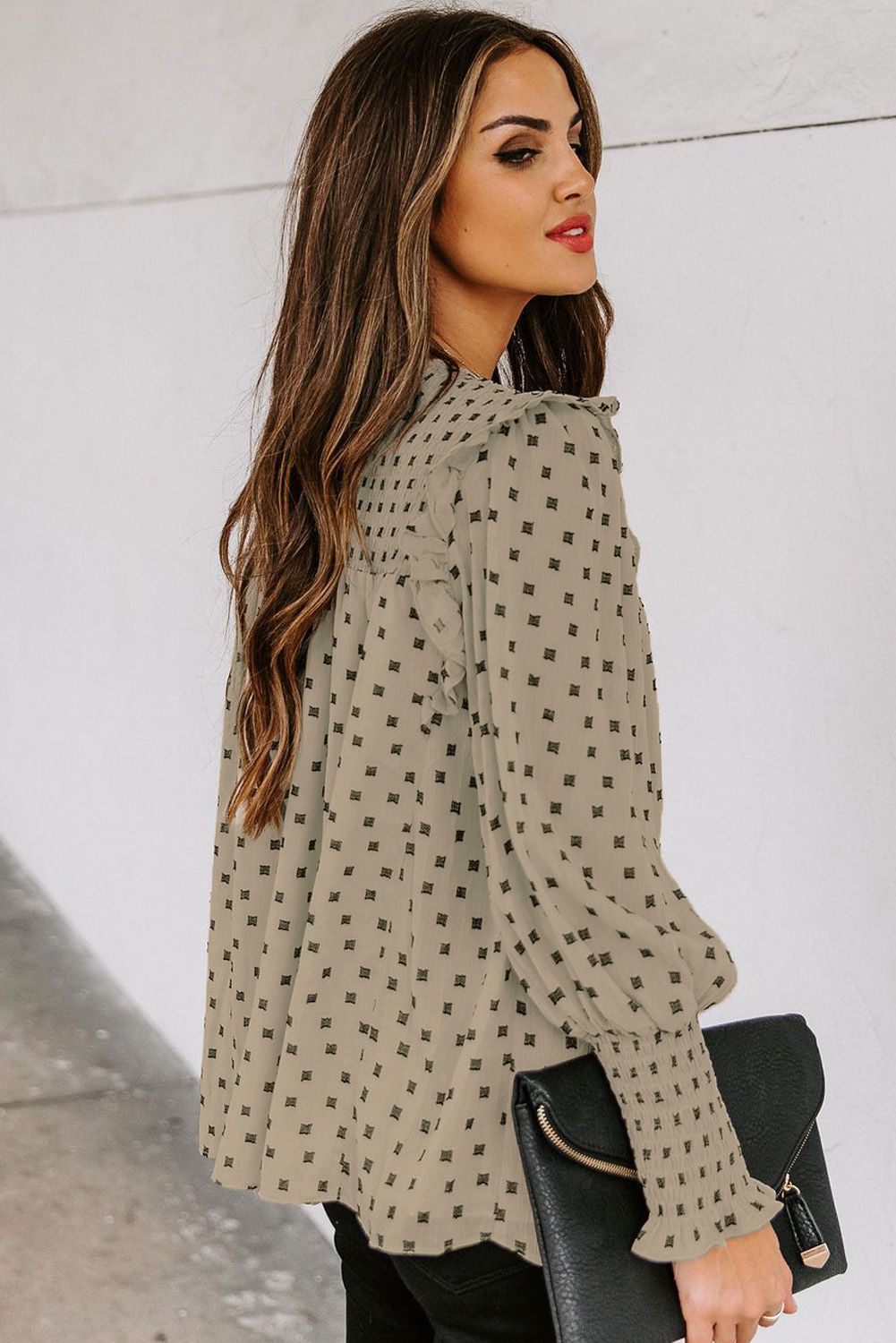 A light crepey fabrication is elevated with square pattern on this relaxed fit blouse
