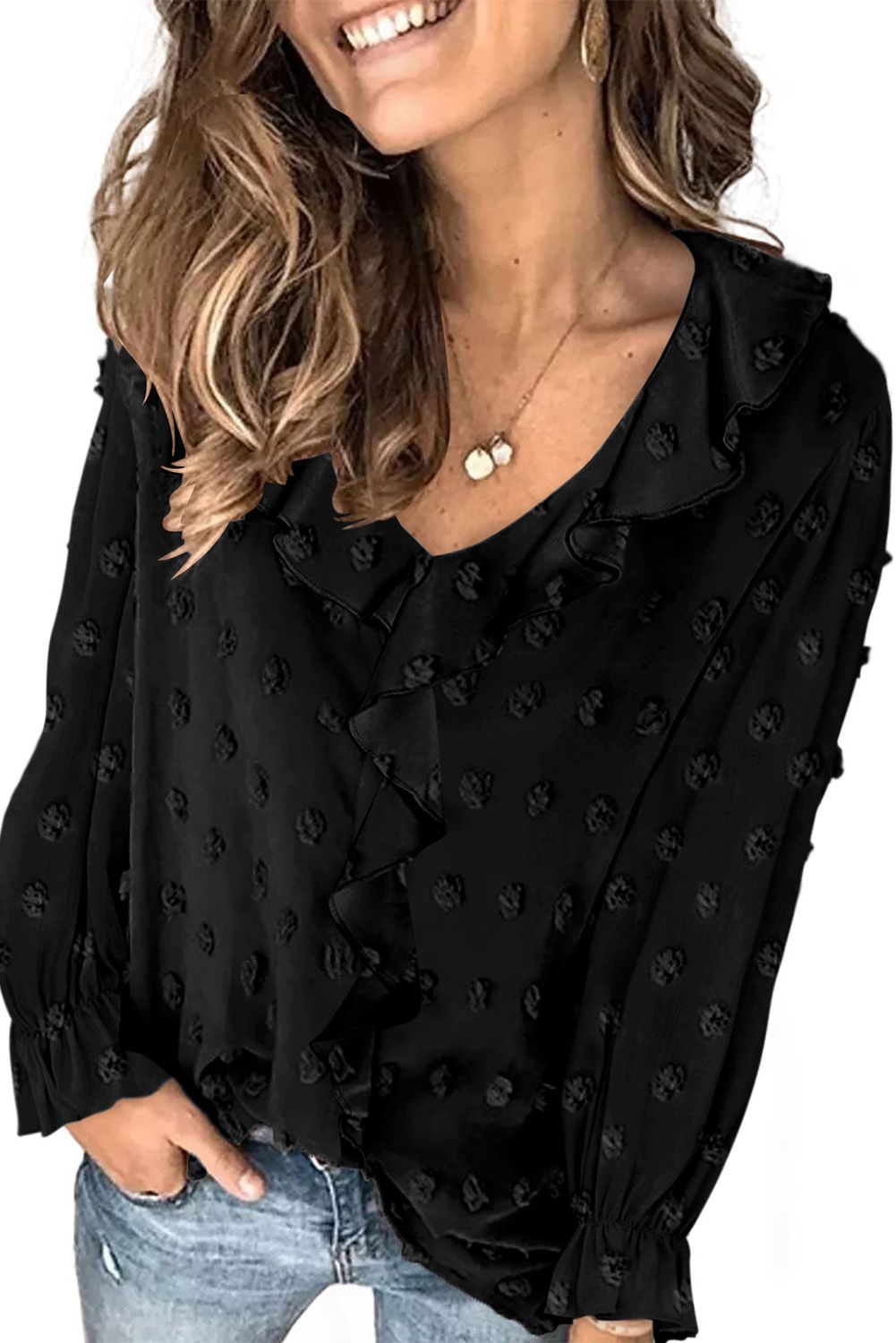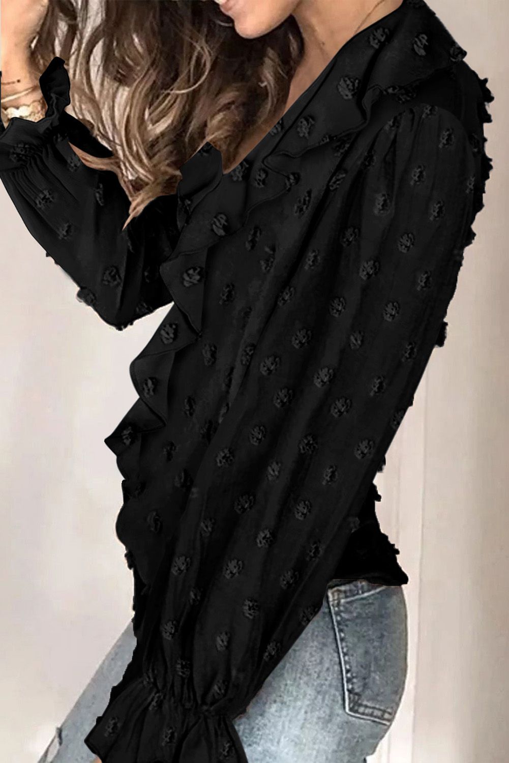 Black Bubble Sleeve V Neck Ruffles Fuzzy Polka Dot Blouse