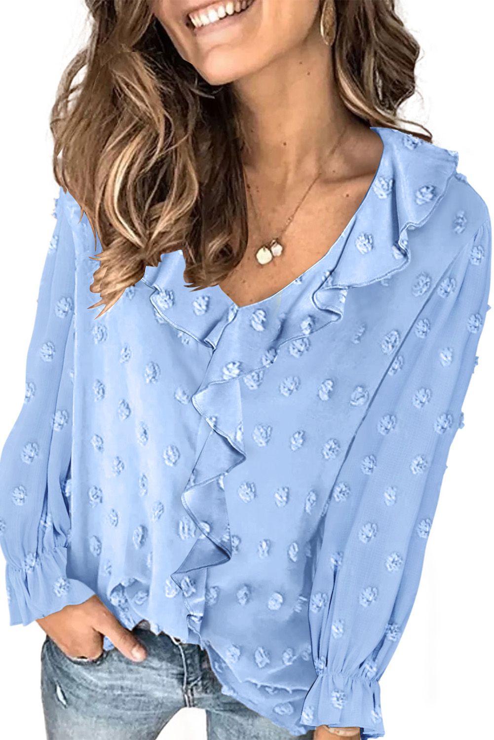 Stylish designs include a sexy v neck with ruffles around and front center straight down, bubble sleeves and romantic polka dot pattern throughout the blouse