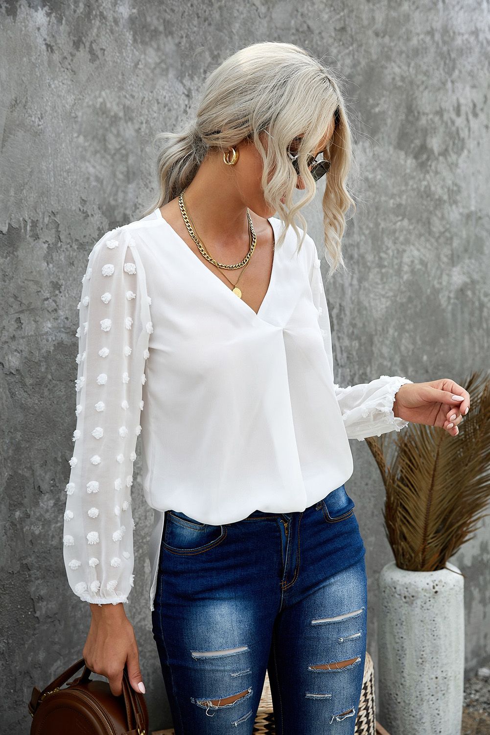 The blouse with the v neckline to highlight your neck and collar bone