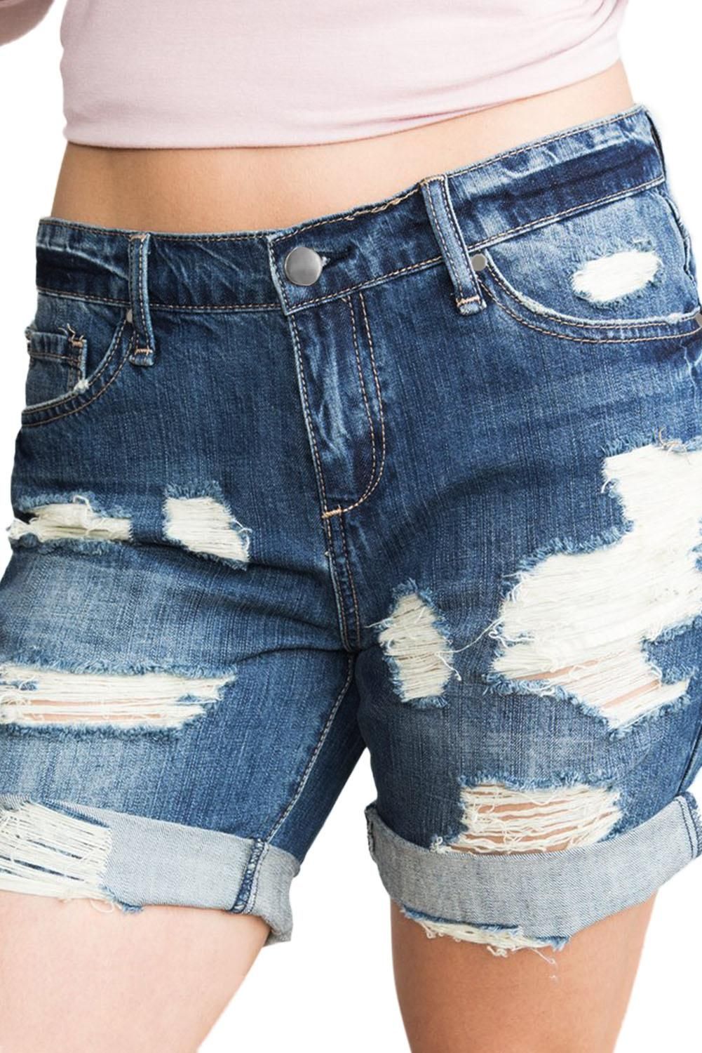 Five functional pockets Zipper and button closure Mid rise, relaxed fit, rolled cuffs Distressing detail is actual holes Denim shorts are spring transition staple womens denim shorts of the latest fashion boyfriend style