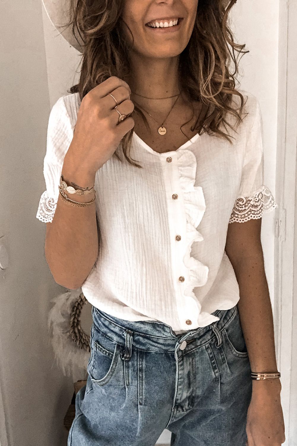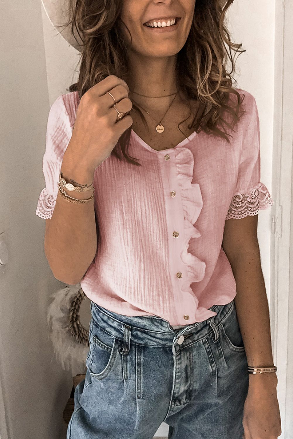 Pink Ruffles Button Short Sleeve Shirt with Lace Detail