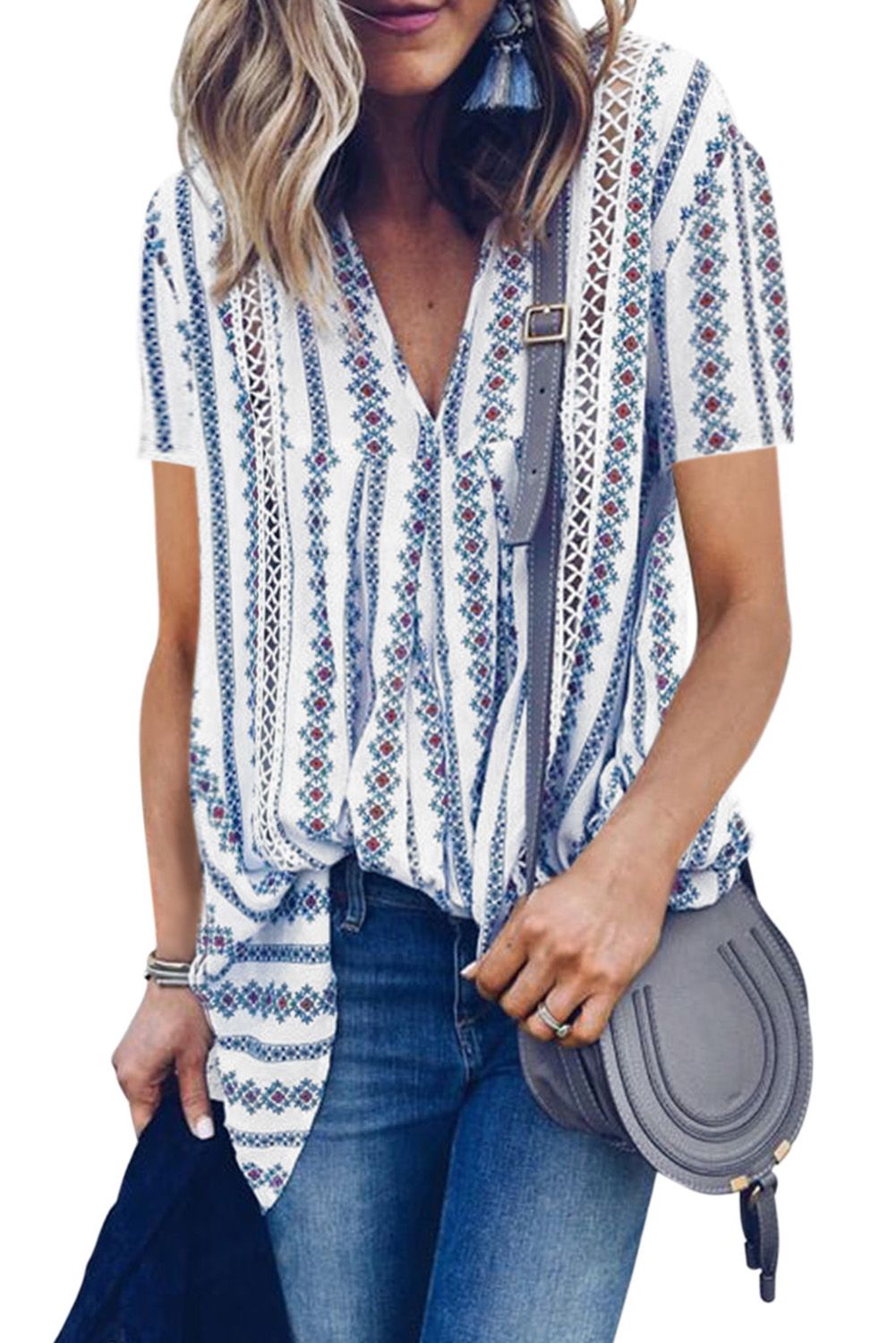Blue Boho Floral Printed V Neck Short Sleeve Blouse